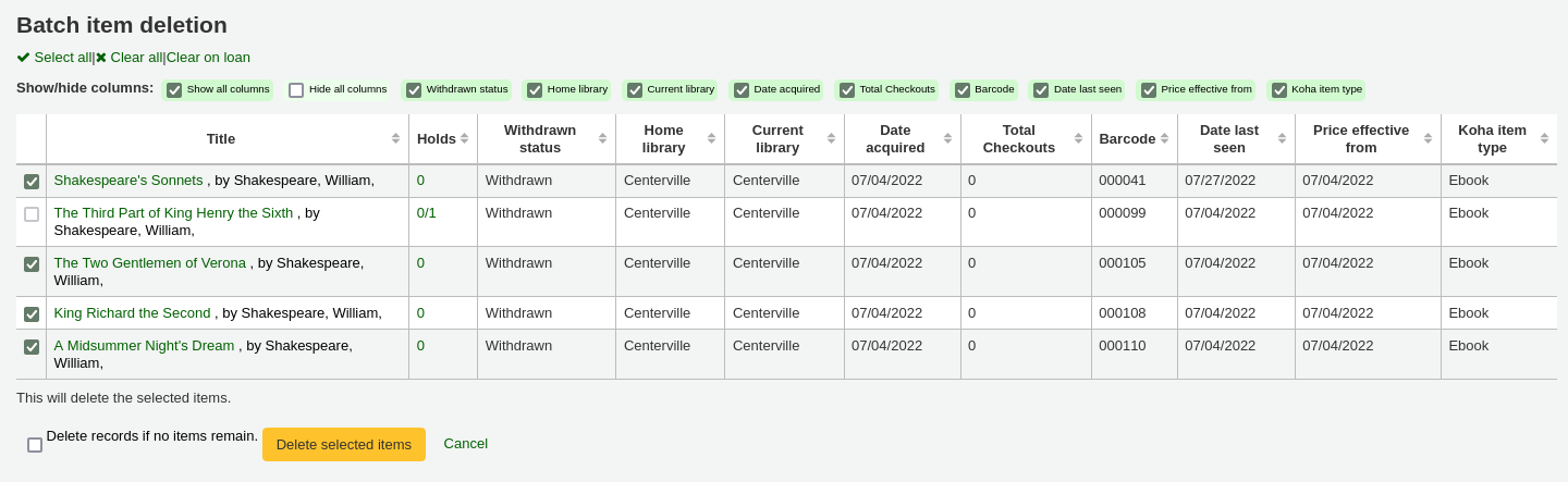 Screenshot of the items batch deletion tool in the new design
