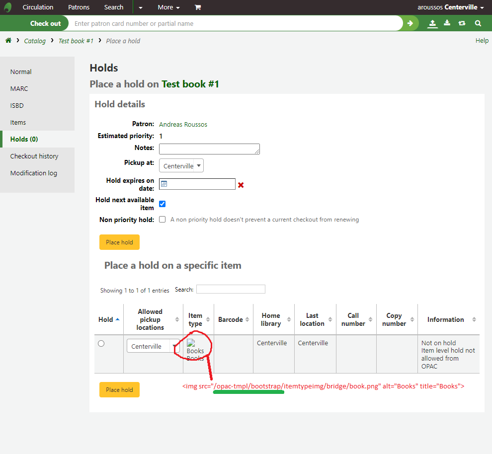 Item type icons broken when placing an item-level hold