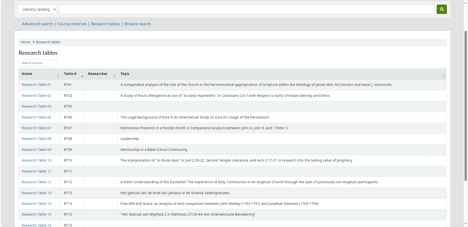 Screenshot of example Research tables on OPAC