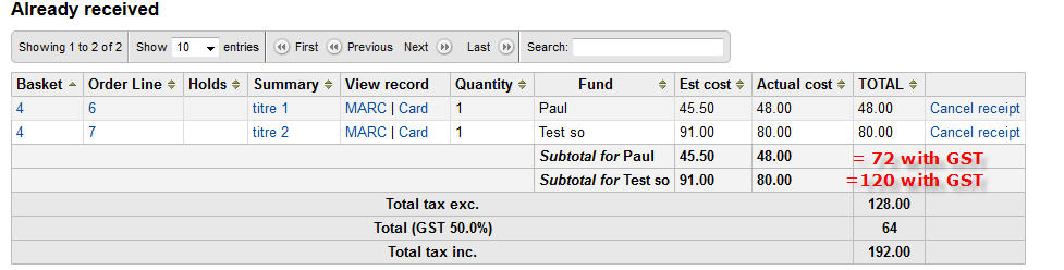 Add holds and funds to items already received in parcel.pl
