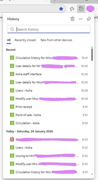 An example of the floating/quick history menu in Edge displaying full patron names, after a staff user has logged out of Koha.