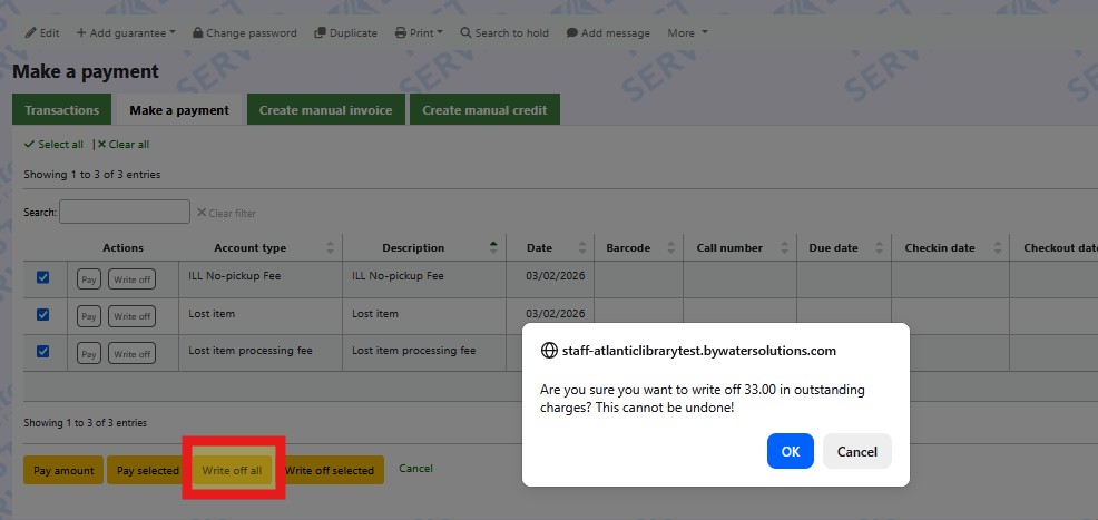 Screenshot of "Write off all" pop-up.