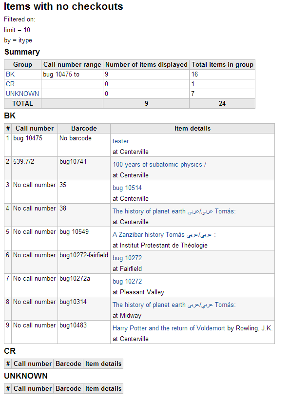 items with no checkouts report does not work