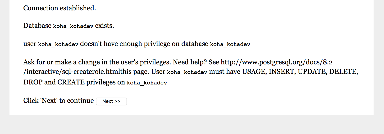 Installer shows PostgreSQL info when wrong DB permissions