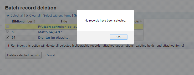 | Bug 16949: Batch record deletion says success when no records have been passed in | patch | 2016-07-28 21:22:53 UTC | 2.50 KB | no flags | Details |