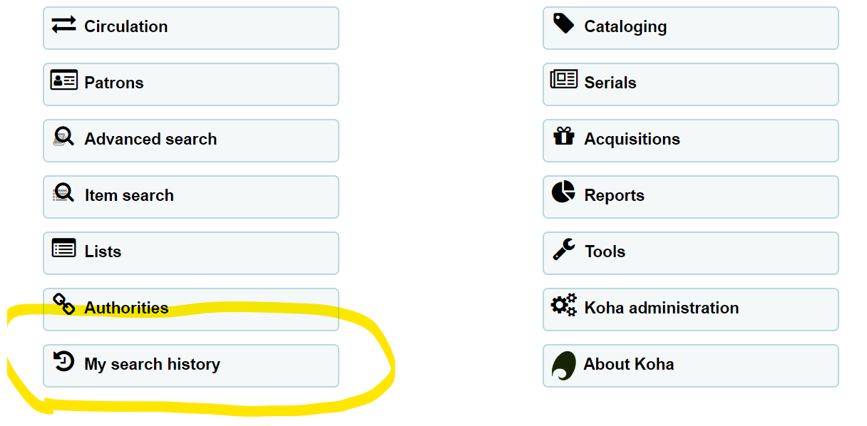 screen shot of Koha staff interface landing page with added 'my search history' icon