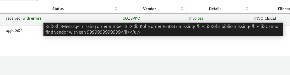 | martin.renvoize | 2025-05-26 14:56:27 UTC | Text to go in the release notes | , allowing easier review and follow-up. **Impact:** Helps acquisitions staff and sysadmins quickly identify and resolve issues with vendor data. **Summary:** Previously, EDIFACT import errors were only visible in server logs, making troubleshooting difficult for staff. **Fix:** Errors are now logged in a location accessible via the staff interface |
