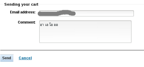 Screenshot of Sent Cart page, showing how the comment should read Screenshot of email received Screenshot of cart email form Screenshot of cart email received Screenshot of list email form Screenshot of list email received Patch for correcting the cart email encoding Patch for correcting the list email encoding |