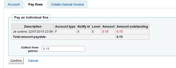 Created attachment 41208 [details] [review] Bug 14605 - Corrects the individual fine's description When paying a fine, the description is built out of the borrower's type and title, instead of the actual fine's description. STEPS: 1) in the staff, go to a user with a fine to pay. a) if none, go to a user and Fines>>"Create manual invoice" with a distinctive description. 2) In Fines>>Pay fines, click the "Pay" button on the line of the fine. 3) This will take you a "Pay an individual fine" screen, where the description will look like "Staff Mrs", for the category and title of the borrower. It looks like »Description« and »Account type« were mixed up. When I apply the patch, I have the fine description in »Description«, but also in »Account type«. I suppose this is where the user category should go. Can you confirm and adjust the patch? Created attachment 41216 [details]