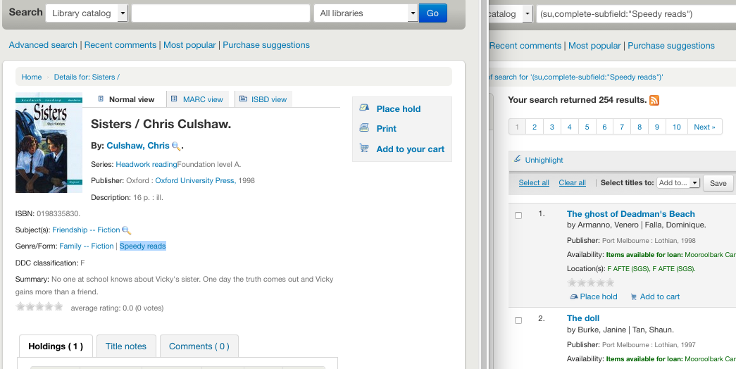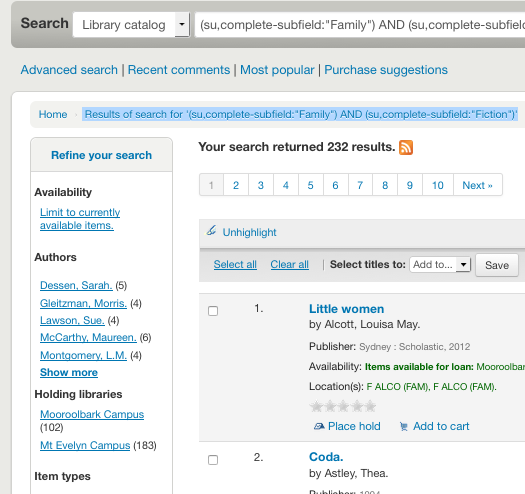 my hunch is that the CCL syntax for the search query is incorrect my example returns no results.. (su,complete-subfield:"Family") AND (su,complete-subfield:"Fiction") (In reply to Mason James from comment #5) > my hunch is that the CCL syntax for the search query is incorrect > > my example returns no results.. > (su,complete-subfield:"Family") AND (su,complete-subfield:"Fiction") the other issue is that the 650$x and/or 655$x subfields don't seem to be configured to be indexed by Zebra in.. /etc/koha/zebradb/marc_defs/marc21/biblios/biblio-koha-indexdefs.xml (and others) ..so a query for (su,complete-subfield:"Fiction") would be expected to fail, as that info is located in the unindexed 655$x subfield (In reply to Mason James from comment #6) > (In reply to Mason James from comment #5) > > my hunch is that the CCL syntax for the search query is incorrect > > > > my example returns no results.. > > (su,complete-subfield:"Family") AND (su,complete-subfield:"Fiction") > > the other issue is that the 650$x and/or 655$x subfields don't seem to be > configured to be indexed by Zebra in.. > /etc/koha/zebradb/marc_defs/marc21/biblios/biblio-koha-indexdefs.xml (and > others) > > ..so a query for (su,complete-subfield:"Fiction") would be expected to fail, > as that info is located in the unindexed 655$x subfield good news, i have a fix for this... i'll attach a patch soon Created attachment 44040 [details] [review] Bug 15048 - subject/genre (650/655) searches fail on searches with $x 'General subdivision' subfield values to test... 1/ define both a 655$a *and* 655$x value in a bib, save, reindex 2/ in opac-detail.pl click bib's genre/form url, the search should FAIL to return a result (BAD!) :/ 3/ apply patch 4/ copy updated files to your live zebradb dir (or build/install a debian package) $ sudo cp ./etc/zebradb/marc_defs/marc21/biblios/biblio-koha-indexdefs.xml \ /etc/koha/zebradb/marc_defs/marc21/biblios/biblio-koha-indexdefs.xml $ sudo cp etc/zebradb/marc_defs/marc21/biblios/biblio-zebra-indexdefs.xsl \ /etc/koha/zebradb/marc_defs/marc21/biblios/biblio-zebra-indexdefs.xsl 5/ run a full zebra reindex 6/ in opac-detail.pl click bib's genre/form url, the search should return a result (GOOD!) :0) Created attachment 44041 [details]