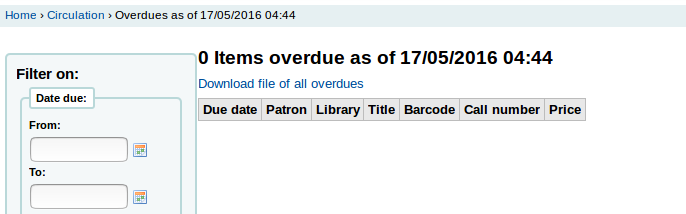 Created attachment 51557 [details] [review] Bug 16531: Circ overdue report is showing an empty table if no overdues To test: 1) Ensure you have no items overdue 2) Go to Circ -> Circulation reports -> Overdues 3) Notice empty table, '0 items overdue' heading 4) Apply patch and refresh page 5) Notice empty table is no longer showing and page prompts you to choose filters to see results 6) Check out an item to a member, ensure due date is a date that has passed (i.e. yesterday) 7) Refresh overdue report page 8) Confirm table now shows correctly with '1 items overdue' heading etc. Sponsored-by: Catalyst IT I think we can improve this page by giving the user more information about why nothing is displaying. I can think of two cases to plan for: 1. Nothing displays because there are no overdues. By default the overdue report show anything which is overdue, with no filters applied by default. If we know we're showing the unfiltered view, we can show a message which says "There are no overdues." 2. Nothing displays because the user has applied a filter to the results. ( "[% IF ( isfiltered ) %]" ). In this case we display a message which says something like, "There are no overdues matching your search." This would also allow us to display a link to "Reset filter," which is shown without this patch but isn't with the patch. Created attachment 51729 [details] [review] Bug 16531: Circ overdue report is showing an empty table if no overdues EDIT: Comment 2 To test: 1) Ensure you have no items overdue 2) Go to Circ -> Circulation reports -> Overdues 3) Notice empty table, '0 items overdue' heading 4) Apply patch and refresh page 5) Notice empty table is no longer showing and page says "There are no overdues" 6) Apply a filter to search 7) Page now says "There are no overdues matching your search" with a link to reset filter. 8) Click Reset filter -> confirm any filters you applied are cleared. 9) Check out an item to a member, ensure due date is a date that has passed (i.e. yesterday) 10) Refresh overdue report page 11) Confirm table now shows correctly with '1 items overdue' heading etc. Sponsored-by: Catalyst IT Created attachment 51769 [details] [review] [SIGNED-OFF] Bug 16531: Circ overdue report is showing an empty table if no overdues EDIT: Comment 2 To test: 1) Ensure you have no items overdue 2) Go to Circ -> Circulation reports -> Overdues 3) Notice empty table, '0 items overdue' heading 4) Apply patch and refresh page 5) Notice empty table is no longer showing and page says "There are no overdues" 6) Apply a filter to search 7) Page now says "There are no overdues matching your search" with a link to reset filter. 8) Click Reset filter -> confirm any filters you applied are cleared. 9) Check out an item to a member, ensure due date is a date that has passed (i.e. yesterday) 10) Refresh overdue report page 11) Confirm table now shows correctly with '1 items overdue' heading etc. Sponsored-by: Catalyst IT Signed-off-by: Owen Leonard <oleonard@myacpl.org> With this patch, the noreport variable becomes useless. However it seems that it's useful in case of FilterBeforeOverdueReport is set. Please double check. Created attachment 53059 [details] [review] Bug 16531: Circ overdue report is showing an empty table if no overdues EDIT: Comment 2 EDIT2: using noreport variable (Comment 5) To test: 1) Ensure you have no items overdue 2) Go to Circ -> Circulation reports -> Overdues 3) Notice empty table, '0 items overdue' heading 4) Ensure syspref FilterBeforeOverdueReport is set to 'Don't require' 5) Apply patch and refresh page 6) Notice empty table is no longer showing and page says "There are no overdues" 7) Apply a filter to search 8) Page now says "There are no overdues matching your search" with a link to reset filter. 9) Click Reset filter -> confirm any filters you applied are cleared. 10) Set FilterBeforeOverdueReport to 'Require' and refresh overdue report 11) Page should say "Please choose one or more filters to proceed" 12) Check out an item to a member, ensure due date is a date that has passed (i.e. yesterday) 13) Refresh overdue report page 14) Page should still say "Please choose one or more filters to proceed" 15) Set FilterBeforeOverdueReport to 'Don't require' 16) Confirm table now shows correctly with '1 items overdue' heading etc. Sponsored-by: Catalyst IT Signed-off-by: Owen Leonard <oleonard@myacpl.org> Created attachment 53322 [details] [review] [SIGNED-OFF] Bug 16531: Circ overdue report is showing an empty table if no overdues EDIT: Comment 2 EDIT2: using noreport variable (Comment 5) To test: 1) Ensure you have no items overdue 2) Go to Circ -> Circulation reports -> Overdues 3) Notice empty table, '0 items overdue' heading 4) Ensure syspref FilterBeforeOverdueReport is set to 'Don't require' 5) Apply patch and refresh page 6) Notice empty table is no longer showing and page says "There are no overdues" 7) Apply a filter to search 8) Page now says "There are no overdues matching your search" with a link to reset filter. 9) Click Reset filter -> confirm any filters you applied are cleared. 10) Set FilterBeforeOverdueReport to 'Require' and refresh overdue report 11) Page should say "Please choose one or more filters to proceed" 12) Check out an item to a member, ensure due date is a date that has passed (i.e. yesterday) 13) Refresh overdue report page 14) Page should still say "Please choose one or more filters to proceed" 15) Set FilterBeforeOverdueReport to 'Don't require' 16) Confirm table now shows correctly with '1 items overdue' heading etc. Sponsored-by: Catalyst IT Signed-off-by: Owen Leonard <oleonard@myacpl.org> Created attachment 53434 [details] [review] Bug 16531: Circ overdue report is showing an empty table if no overdues EDIT: Comment 2 EDIT2: using noreport variable (Comment 5) To test: 1) Ensure you have no items overdue 2) Go to Circ -> Circulation reports -> Overdues 3) Notice empty table, '0 items overdue' heading 4) Ensure syspref FilterBeforeOverdueRepor