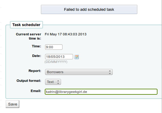(In reply to Nicholas van Oudtshoorn from comment #38) > Hopefully this is the right bug to write about this in. Just noticed that > runreport.pl (which I'm calling manually from a cron job), whilst allowing > for a format of html, doesn't set the "Content-Type" on such emails to > "text/html". > I am not sure about that, Nicholas. This bug is about scheduling running reports, not about mailing in html format. If you can't find a more specific bug, please open a new report for it. And your patch is welcome too. Preferably as formatted by git. (Look for instructions on using git-bz; that will make it easier for you.) Thanks. Sorry about the noise. Have created the new bug report (10777), and will upload patch there shortly! (In reply to Nicholas van Oudtshoorn from comment #40) > Sorry about the noise. Have created the new bug report (10777), and will > upload patch there shortly! Thx (In reply to Nicholas van Oudtshoorn from comment #40) > Sorry about the noise. Have created the new bug report (10777), and will > upload patch there shortly! A patch more than makes up for it, people can make as much noise as they want, if they also send patches ;) Dear Sophie, I have made changes in the koha files according to the patch you had attached in this thread. But emails are still not generating and recipient does not receive any emails. I have also checked the at.allow and at.deny file. my at.deny file is empty that , according to my understanding , means all the users have the permissions to run task scheduler. Kindly help me with the solution ,as i am stuck on this from last few days. When i schedule a task using task scheduler. It showed me the following command under the action tab. export KOHA_CONF="/etc/koha/koha-conf.xml"; /usr/share/koha/intranet/cgi-bin/misc/cronjobs/runreport.pl --format csv --to ghulam.sarwar@techlogix.com 6 Looking forward to your reply. (In reply to Sophie MEYNIEUX from comment #11) > Test plan (as illustrated by Chris screenshots) > - Tools > Task scheduler > or > Reports > Use saved > Schedule (on the line of the report you want tu run) > - Select time, date, report to run (if not already chosen), output format, > mail to send the result. > - Click on Save > > Scheduled report is added to the table of existing scheduled reports under > the form. > > Without the patch, after planned time, if you refresh the page, scheduled > report is not displaied anymore, but report is not run and no mail is sent. > > With the patch, after planned time, recipient receive a mail containing the > result of the report in plain text or attached as csv file dépending of > choosen option. I got it to work by changing the command definition in tools/scheduler.pl