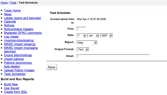 I like Galen's idea of using a database table to store reports, and then using a cronjob to execute those reports on a periodic basis. I'm not sure if we even need to allow them to specify an exact time though. One of our libraries mentioned wanting to have daily/weekly/monthly reports. It would probably be enough to set up three cronjobs (daily, weekly, monthly), and then run the reports (or jobs) that have been designated as such in the DB table. After all, if the report is run before the library opens or after it closes, it should provide all the functionality desired. I would have my doubts about needing a report run at 1:35pm each day. I suppose it is possible though that you might want "morning" and "afternoon" reports, so maybe it is worth using times in the DB table. Or perhaps that's where you just add another cronjob daily cronjob for a different time. That would give the sysadmin ultimate say while also giving librarians the overall functionality that they desire. Robin also suggested using the 'batch' command which "executes commands when system load levels permit" (source: man batch (1) ). I was able to make it work using Wajasu's method. But the html is still not working. Requires re-write of scheduler.pl CGI. This bug might be related: Bug 14712 - Feature for controlling cron jobs/cmd line scripts from staff client http://bugs.koha-community.org/bugzilla3/show_bug.cgi?id=14712 There are people in Sweden working on it. I'm also working on a related feature via my work on bug 10662. My work is also sponsored by folks in Sweden, so hurray Sweden! I've been thinking about opening a new bug, or looking up one of these bugs to post patches. Basically, I've written a task scheduler, which accepts a few variables (e.g. start_time, repeat_interval, task_type, params). It then uses plugin modules to run the actual task. I've already written plugins to download records via OAI-PMH, and to upload those records to a new Koha API for OAI-PMH records specifically. It would be fairly trivial to create a "Report" plugin. The web user interface relies on a template include which is matched to the plugin. The whole thing needs some work, but I'm hoping folks will test it and I'm looking at polishing it up... At the moment, it's all at bug 10662, but I'm thinking of breaking into different bug reports... This is a minor issue, but trivial to implement once the gory work on the scheduler itself is complete -- When scheduling reports the list of reports in the drop-down menu should be alphabetized. Most libraries have a large inventory of reports, so having them in alphabetical order makes a lot of sense. *** Bug 20673 has been marked as a duplicate of this bug. *** After seeing a comment on #3935, I was thinking that maybe this is worth another revisit sometime soon. There are lots of pre-existing job queues and task schedulers out there in the world, but - considering our embracing of the Mojolicious framework - maybe we should opt for Minion (https://mojolicious.org/perldoc/Minion). Martin Renvoize has advocated this in the past and has some experience with it, I think. For #10662, I wrote a job queue / task scheduler using https://metacpan.org/pod/POE::Component::JobQueue and https://metacpan.org/pod/POE::Wheel::Run. I had looked at Minion a bit, but I think we hadn't accepted Mojolicious yet, and I had some requirements (like deleting already enqueued jobs before they had a chance to run) which it didn't seem to have. I think the hardest thing for this issue is not the work itself... but making a choice in a sea of possibilities. On that note, maybe this is an issue that would best be addressed using plugins. We could create a uniform task scheduler user interface and internal API, and then the "hard work" of interfacing with a particular scheduling system could be left up to a plugin. That also means that we could experiment a bit before forging ahead with "The One True Way"? I've been thinking more about this recently. How to be all things to all people? For instance, the original Koha task scheduler for Bug 1993 was meant to schedule a report to run once at an absolute time and email the result to someone. Bug 25245 wants plugins to be able to run every night. That is, a periodic task that runs at the same time every day/night (while not being too fussed on exact start/end times). Bug 10662 wants to schedule tasks to run every X seconds. That is, a periodic task that runs X seconds after it last ran. Those are arguably 3 different types of schedules. The Celery project would handle that using ETA and Periodic Tasks: https://docs.celeryproject.org/en/stable/userguide/calling.html#eta-and-countdown https://docs.celeryproject.org/en/latest/userguide/periodic-tasks.html Looking at cron, we can see it just loops infinitely and sleeps for 1 minute at a time then checks what jobs need to run: https://github.com/cronie-crond/cronie/blob/master/src/cron.c#L358 In the past, I've used timers using Perl's POE or Golang's Timer to alert me when a job needs to start. That's fine so long as your process runs forever. You do need to persist the job data, so that if you restart you can re-create your timers. In terms of the actual implementation... lately I'm thinking a daemon with a HTTP API so you can create, retrieve, update, delete, start timer, stop timer. When a timer does fire... the daemon should add the task to a queue. (This is also what cron does https://github.com/cronie-crond/cronie/blob/master/src/cron.c#L589). Now that queue could be a RabbitMQ message queue. It could be an in-memory queue in the task scheduler daemon and it could run tasks itself by forking a child process, using a thread (if not Perl), or using a connected worker. It could be a database table. On that note, it becomes apparent to me that we don't need to depend on Bug 22417 to move forward here. The task scheduler can be a black box with an API for the front end, and then pluggable backends for different queue systems. 
