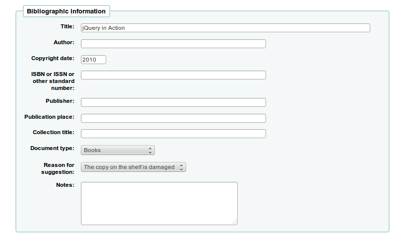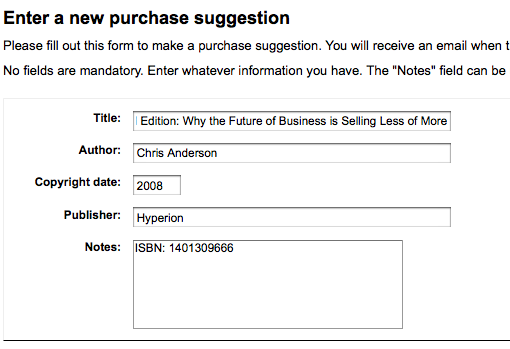 At some point this field was changed back to only 80 characters ... and the text field in the OPAC is limited to only 50 cgi-bin/koha/opac-suggestions.pl?op=add Titles can be very long ... and this 50/80 character limit is too small. Nicole This bug is still valid in master as of 3.12 beta1 This needs a DB upgrade. Will do that with Chris' help later this week. Yay! :) Created attachment 17690 [details] [review] proposed patch Created attachment 17724 [details] [review] [SIGNED-OFF] Bug 2046 - Suggestions: Title Field too small Increase both on staff and OPAC interface from 80 to 255 characters to be saved in the database. Shown will be 80 characters. Signed-off-by: Owen Leonard <oleonard@myacpl.org> Created attachment 17747 [details] [review] [PASSED QA] Bug 2046 - Suggestions: Title Field too small Increase both on staff and OPAC interface from 80 to 255 characters to be saved in the database. Shown will be 80 characters. Signed-off-by: Owen Leonard <oleonard@myacpl.org> Signed-off-by: Katrin Fischer <Katrin.Fischer.83@web.de> Clean patch, workes as described. To test: - Apply patch and run database update - Check that the column in the database is now varchar(255) - Enter a new suggestion in the OPAC - Edit this suggestion in staff - Confirm form has the new max value set Created attachment 17748 [details]