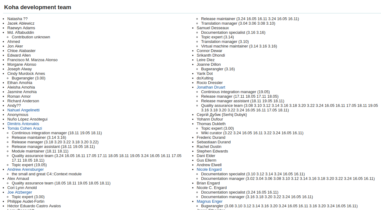 I wonder if Owen has any hints/tips regarding the slightly modified look of the 'Koha Development Team' section (I've attached before and after screenshots).. I've run aground at displaying the extra information given to us regarding team role breakdown for each contributor. Also.. there's still a couple of '???' contributors in there.. I'd love to get Chris's thoughts on those people. Some small stuff: - Bugwrangler => Bug wrangler - Maybe add punctuation between versions? - Some of the roles are still not quite right, but were before. Maybe this is not the latest version? :( - Some additional fix to smuggle into history.txt: Rachel Hamilton-Willams of Katipo sends access to the katipo cma to edit the new koha.org site => ... Katipo CMS ... I generally like the more structured display of information :) Natasha was an Academy student who didn't want to use her last name. So can we make that just Natasha. (I do know, who it is but respect their wish for privacy) So Andy is kb2qzv Which leads to https://sourceforge.net/u/kb2qzv/wiki/Home/ But I am 99% sure it is actually Benedict https://www.postgresql.org/message-id/20000509083006Z72802-9734%2B1003%40priv0.onet.pl Who was doing tons of work on Koha at that time https://lists.gnu.org/archive/html/koha-cvs/2004-04/msg00060.html Awesome, thanks for the clarifications Chris [U+1F60A], I've really enjoyed doing this patch, learning a little bit more about kohas' history and all the great people who have been part of it. I'll give this patch another update with this new info and taking Katrins suggestions into account too. Created attachment 88869 [details] [review] Bug 21662: Make history.txt whitespace consistent Created attachment 88870 [details] [review] Bug 21662: Update history.txt Created attachment 88871 [details] [review] Bug 21662: Add Contributors.yaml file Created attachment 88872 [details] [review] Bug 21662: Use contributors.yaml for contributors list Created attachment 88873 [details] [review] Bug 21662: Other history correction Hows this Katrin? Created attachment 88898 [details] [review] Bug 21662: Make history.txt whitespace consistent Created attachment 88899 [details] [review] Bug 21662: Update history.txt Created attachment 88900 [details] [review] Bug 21662: Add Contributors.yaml file Created attachment 88901 [details] [review] Bug 21662: Use contributors.yaml for contributors list Created attachment 88902 [details] [review] Bug 21662: Other history correction That last update removes all the 'Contributions Unknown' lines I'd inadvertently added as notes for myself to revisit later. One day I'd love to dig further into the history to understand what these people have done but I think that can be for another bug. The QA script has some complaints: