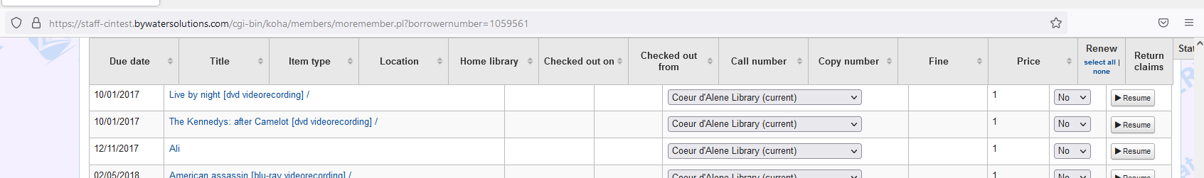 Ignore the comment about the orphaned column header. We hide a particular column through css (because it can't be turned off) and it was showing up in the floating toolbar. The other issue (checkout header appearing on the holds tab) still exists. |