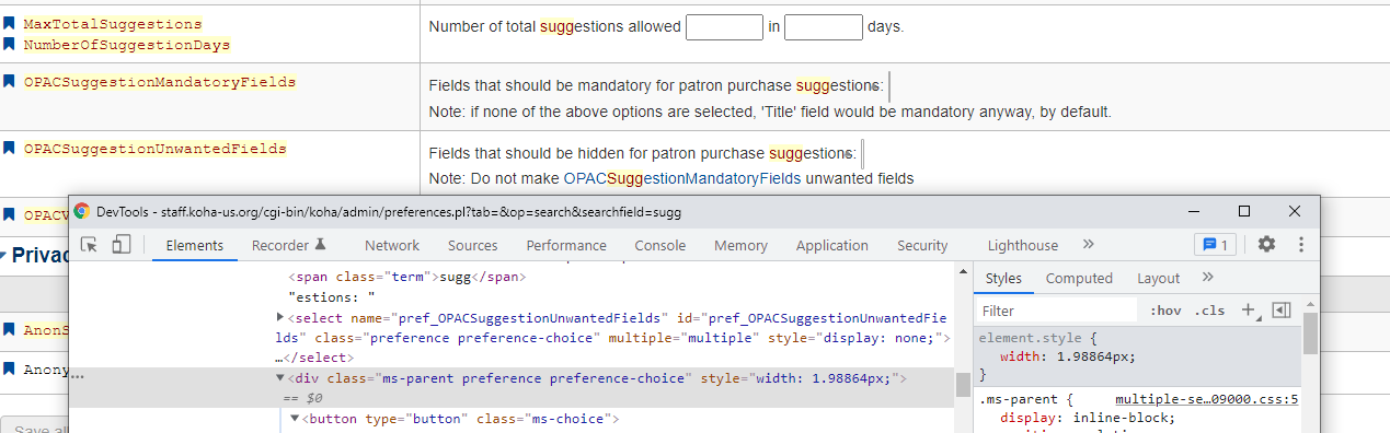 Can you give an example of where Select2 is used in Admin preferences? I am only aware of the usage in Cataloguing (items, authorities and bibliographic records). Does the problem appear there as well? (In reply to Katrin Fischer from comment #1) > Can you give an example of where Select2 is used in Admin preferences? I am > only aware of the usage in Cataloguing (items, authorities and bibliographic > records). Does the problem appear there as well? The following sys prefs is where I see the issue, pretty consistently in the test server and occasionally in my production server. None of them appear to be select_2s but I might just be missing it. ArticleRequestsMandatoryFields ArticleRequestsMandatoryFieldsItemOnly ArticleRequestsMandatoryFieldsRecordOnly BatchCheckoutsValidCategories MarkLostItemsAsReturned OPACHoldsIfAvailableAtPickupExceptions CoceProviders SocialNetworks OPACSuggestionMandatoryFields OPACSuggestionUnwantedFields AutoShareWithMana These use a different plugin: Multiple Select (https://multiple-select.wenzhixin.net.cn/). I don't see the described problem, so if someone is able to better isolate the conditions that cause it please let us know. Created attachment 131725 [details]