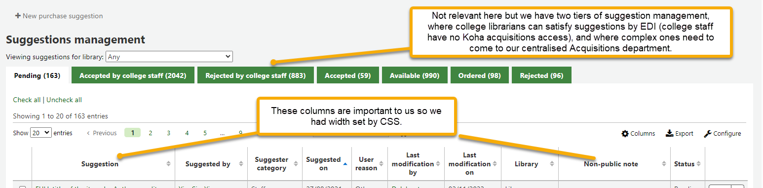 I don't see this problem in my test system. What version of Koha are you using? (In reply to Owen Leonard from comment #1) > I don't see this problem in my test system. What version of Koha are you > using? Hi, I tested on 20.05.03. Looks like it mostly concerns the Accepted tab https://www.screencast.com/t/smvcBvOlvnc Marjorie Can't see the problem in 20.05.03. My next idea is to make sure we're trying it in the same browser. The other possibility is that one of your suggestions which only appears onscreen when you switch to 100 results has a very long string of unbroken text. That would force the table cell to expand to accommodate it. (In reply to Owen Leonard from comment #3) > Can't see the problem in 20.05.03. My next idea is to make sure we're trying > it in the same browser. > > The other possibility is that one of your suggestions which only appears > onscreen when you switch to 100 results has a very long string of unbroken > text. That would force the table cell to expand to accommodate it. I tested on firefox and chrome and I had the same problem. But indeed a too long url in a note caused the enlargement of the column. I reduced the url and the display is correct now. I guess it's not necessarily a bug? Thank you for your time Marjorie Owen, do you think we should close this or is this something we could catch better? (maybe shortening contents after a certain length like we can do for the facets?) Created attachment 159150 [details] CSS used to lock down 2 columns. We wanted two columns to be set to fixed width and our support company added some CSS to the IntranetUsercss feature we don't have access to (we see a link to it residing on the server). No promises it would work elsewhere without a tweak, but it looks good for us. table#table_1.sorted.dataTable.no-footer > thead >tr >th:nth-child(2){ width:250px; } table#table_1.sorted.dataTable.no-footer > thead >tr > th:nth-child(10){ min-width: 180px; max-width: 180px; } table#table_1.sorted.dataTable.no-footer > tbody >tr > td:nth-child(2){ width: 250px; } table#table_1.sorted.dataTable.no-footer > tbody >tr > td:nth-child(10){ min-width: 180px; max-width: 180px; } table#table_2.sorted.dataTable.no-footer > thead >tr >th:nth-child(2) { width: 250px; } table#table_2.sorted.dataTable.no-footer > thead >tr >th:nth-child(10){ min-width: 180px; max-width: 180px; } table#table_2.sorted.dataTable.no-footer > tbody >tr >td:nth-child(2){ width: 250px; } table#table_2.sorted.dataTable.no-footer > tbody >tr >td:nth-child(10){ min-width: 180px; max-width: 180px; } table#table_3.sorted.dataTable.no-footer > thead >tr >th:nth-child(2) { width: 250px; } table#table_3.sorted.dataTable.no-footer > thead >tr >th:nth-child(10) { min-width: 180px; max-width: 180px; } table#table_3.sorted.dataTable.no-footer > tbody >tr >td:nth-child(2){ width: 250px; } table#table_3.sorted.dataTable.no-footer > tbody >tr >td:nth-child(10){ min-width: 180px; max-width: 180px; } table#table_4.sorted.dataTable.no-footer > thead >tr >th:nth-child(2) { width: 250px; } table#table_4.sorted.dataTable.no-footer > thead >tr >th:nth-child(10) { min-width: 180px; max-width: 180px; } table#table_4.sorted.dataTable.no-footer > tbody >tr >td:nth-child(2){ width: 250px; } table#table_4.sorted.dataTable.no-footer > tbody >tr >td:nth-child(10){ min-width: 180px; max-width: 180px; } table#table_5.sorted.dataTable.no-footer > thead >tr >th:nth-child(2) { width: 250px; } table#table_5.sorted.dataTable.no-footer > thead >tr >th:nth-child(10) { min-width: 180px; max-width: 180px; } table#table_5.sorted.dataTable.no-footer > tbody >tr >td:nth-child(2){ width: 250px; } table#table_5.sorted.dataTable.no-footer > tbody >tr >td:nth-child(10){ min-width: 180px; max-width: 180px; } table#table_6.sorted.dataTable.no-footer > thead >tr >th:nth-child(2) { width: 250px; } table#table_6.sorted.dataTable.no-footer > thead >tr >th:nth-child(10) { min-width: 180px; max-width: 180px; } table#table_6.sorted.dataTable.no-footer > tbody >tr >td:nth-child(2){ width: 250px; } table#table_6.sorted.dataTable.no-footer > tbody >tr >td:nth-child(10){ min-width: 180px; max-width: 180px; } table#table_7.sorted.dataTable.no-footer > thead >tr >th:nth-child(2) { width: 250px; } table#table_7.sorted.dataTable.no-footer > thead >tr >th:nth-child(10) { min-width: 180px; max-width: 180px; } table#table_7.sorted.dataTable.no-footer > tbody >tr >td:nth-child(2){ width: 250px; } table#table_7.sorted.dataTable.no-footer > tbody >tr >td:nth-child(10){ min-width: 180px; max-width: 180px; } table#table_8.sorted.dataTable.no-footer > thead >tr >th:nth-child(2) { width: 250px; } table#table_8.sorted.dataTable.no-footer > thead >tr >th:nth-child(10) { min-width: 180px; max-width: 180px; } table#table_8.sorted.dataTable.no-footer > tbody >tr >td:nth-child(2){ width: 250px; } table#table_8.sorted.dataTable.no-footer > tbody >tr >td:nth-child(10){ min-width:180px; max-width: 180px; } table.sorted.dataTable.no-footer > tbody >tr >td:nth-child(2) >div.suggestion_note{ width: 250px; height: fit-content; overflow-wrap: break-word; word-wrap: break-word; -ms-word-break: break-all; word-break: break-word; } If it helps, I also see this problem in 22.11.10. |