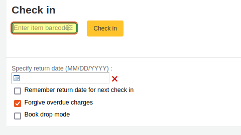Created attachment 153509 [details] screenshot of the problem To recreate: 1. Turn on fines mode 2. Go to returns.pl (/cgi-bin/koha/circ/returns.pl) 3. Expand the the options so you see 'Forgive overdue charges'. 4. Check that box and check in an item 5. The item is checked in but now the input "Enter item barcode" is smaller than it should be and has a yellow background.