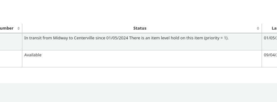 | Summary: | Item statuses in the holdings table on biblio details should appear one per line | ||