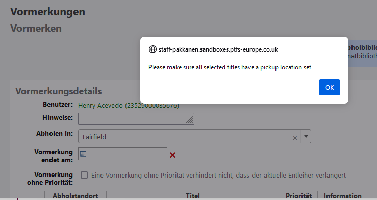 Created attachment 160797 [details] Screenshot of the untranslatable pop up There is a untranslatable string In requeste.tt: "Please make sure all selected titles have a pickup location set" (line 1552). See the attachment. The string shows up when you are making a multi-hold and leave one of the titles without pick-up place and then try to save the holds.