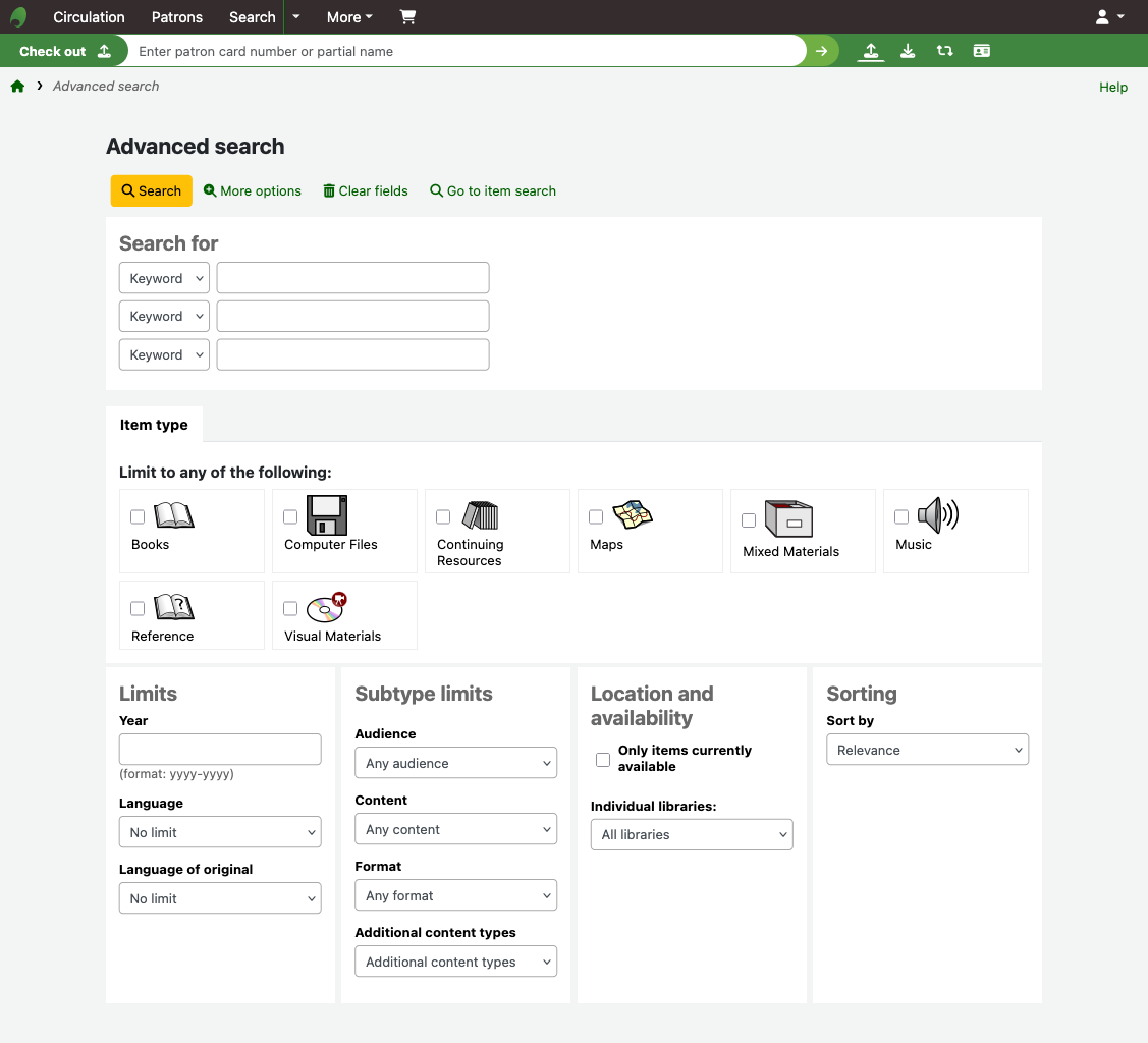 From a MARC21 user: looks good! Makes it all look nicer and clearer :-) Out of curiosity: are you leaving the drop-down lists as they are for this piece of work, or are they going to become more flexible like the Item search picklists? (In reply to Aude Charillon from comment #4) > Out of curiosity: are you leaving the drop-down lists as they are for this > piece of work, or are they going to become more flexible like the Item > search picklists? I didn't intend to make that kind of change. In fact I'm not sure that kind of interface is relevant here? In item search it works well because it's tied to predefined lists of things. I'm open to the idea if someone could make a good case for it but it would definitely be another bug. Created attachment 179833 [details] [review] Bug 39398: Improve style and layout of staff interface advanced search form This patch updates the staff interface advanced search form to make it more responsive and to style it similarly to the item search form. To test, apply the patch and rebuild the staff interface CSS. - Go to the advanced search page in the staff interface. - Test the layout at various widths. Everything should adjust well. - Test in the "More options" view. - Test that adding and removing fields works correctly. - Test when using Zebra and Elasticsearch (SearchEngine system preference). - With Elasticsearch, test with ElasticsearchMARCFormat set to "Searchable array". - Test with IncludeSeeFromInSearches enabled. - Test using both MARC21 and UNIMARC. - Confirm that searching works correctly in all cases. Sponsored-by: Athens County Public Libraries I don't think this is necessarily ready for signoff, but I wanted to send the patch so folks could test. I think it especially needs confirmation that searching is working correctly I'd love to get some opinions from UNIMARC libraries about how we might better break up the options which were previously grouped under the "Afficher les filtres sur les données codées" link. Love it ! I noted an extra <p> under the "Subtype limits" which offset the Audience label. With more test, I noted that clicking the checkbox of the itemtypes doesn't get check, we need to click the images to do so. Created attachment 180975 [details] [review] Bug 39398: (follow-up) Fix click handling of itype/ccode/loc checkboxes I think this is a worthwhile improvement and I'd love to get more eyes on it. Created attachment 184940 [details] [review] Bug 39398: (follow-up) Fix click handling of itype/ccode/loc checkboxes Created attachment 188480 [details] [review] Bug 39398: Improve style and layout of staff interface advanced search form This patch updates the staff interface advanced search form to make it more responsive and to style it similarly to the item search form. To test, apply the patch and rebuild the staff interface CSS. - Go to the advanced search page in the staff interface. - Test the layout at various widths. Everything should adjust well. - Test in the "More options" view. - Test that adding and removing fields works correctly. - Test when using Zebra and Elasticsearch (SearchEngine system preference). - With Elasticsearch, test with ElasticsearchMARCFormat set to "Searchable array". - Test with IncludeSeeFromInSearches enabled. - Test using both MARC21 and UNIMARC. - Confirm that searching works correctly in all cases. Sponsored-by: Athens County Public Libraries Created attachment 188481 [details] [review] Bug 39398: (follow-up) Fix click handling of itype/ccode/loc checkboxes Created attachment 190483 [details] [review] Bug 39398: Improve style and layout of staff interface advanced search form This patch updates the staff interface advanced search form to make it more responsive and to style it similarly to the item search form. To test, apply the patch and rebuild the staff interface CSS. - Go to the advanced search page in the staff interface. - Test the layout at various widths. Everything should adjust well. - Test in the "More options" view. - Test that adding and removing fields works correctly. - Test when using Zebra and Elasticsearch (SearchEngine system preference). - With Elasticsearch, test with ElasticsearchMARCFormat set to "Searchable array". - Test with IncludeSeeFromInSearches enabled. - Test using both MARC21 and UNIMARC. - Confirm that searching works correctly in all cases. Sponsored-by: Athens County Public Libraries Signed-off-by: David Nind <david@davidnind.com> Created attachment 190484 [details] [review] Bug 39398: (follow-up) Fix click handling of itype/ccode/loc checkboxes Signed-off-by: David Nind <david@davidnind.com> Testing notes (using KTD): 1. The issues noted below happened before the patch as well, so are existing behavours. 2. I didn't really test ElasticsearchMARCFormat set to "Searchable array" and IncludeSeeFromInSearches, as I'm not sure what I'm looking for. Had them enabled though. MARC21 and UNIMARC - Zebra and Elasticsearch - quotes around search term ============================================ 1. Search so that you get no results (with or without more options toggled): - Keyword: a - Keyword for UNIMARC: sdfg - Subtype: Audience = Preschool (or primary for UNIMARC) 2. You get no results 3. Click "Edit this search" 4. Note that the keyword (a or sdfg) has quotes around it 5. Click search again 6. Still no results 7. Click "Edit this search" again 8. Note that there are now two sets of quotes around the a: ""a"" 9. If you keep repeating this, you get more quotes 10. Not sure if this actually makes any difference or not UNIMARC - Zebra and Elasticsearch ================================= 1. Under the 'Picture' options, there are two dropdown lists, starting with Any but with different values. There are no field labels shown. Maybe call them what UNIMARC field 116 builder calls them? (https://www.ifla.org/unimarc-updates/unimarc-bibliographic-format-manual-online-ed/ page 120) - Specific material designation (or Material) (collage, drawing, etc) - Primary support mate