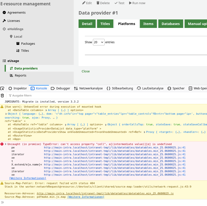 Created attachment 188441 [details] bug on console to recreate: - add a data provider to harvest sushi data in /cgi-bin/koha/erm/eusage/usage_data_providers - I used Hanser as it seems not to reply with a PR report !!! - add Report types: PR - perform a harvest - then go to /cgi-bin/koha/erm/eusage/usage_data_providers/<provider id> - open developer tools (F12 on Firefox) - click on Platforms - see error in console - any other click won't work in providers nav bar