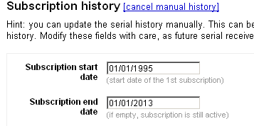 Created attachment 8240 [details] histenddate box legend May be I missed something but even if the subscription history displays the following legend below the histenddate box: (if empty, subscription is still active) the new subscription enddate is systematically copied as histenddate during the renew process as we can see in the ReNewSubscription function (line 1332 from Serial.pm) : $query = qq| UPDATE subscriptionhistory SET histenddate=? WHERE subscriptionid=? |; $sth = $dbh->prepare($query); $sth->execute( $enddate, $subscriptionid );