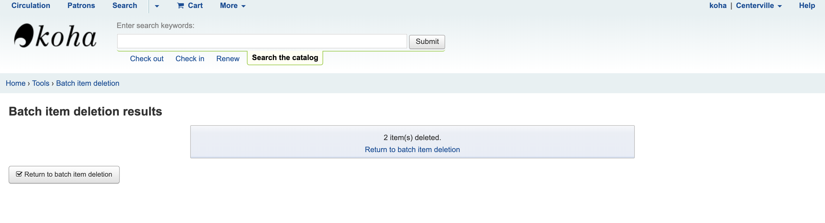 Moreover the batch item deletion display all the item info, which is not needed. We would prefer to see the number of holds and checkouts, as is it for the Batch record deletion tool.