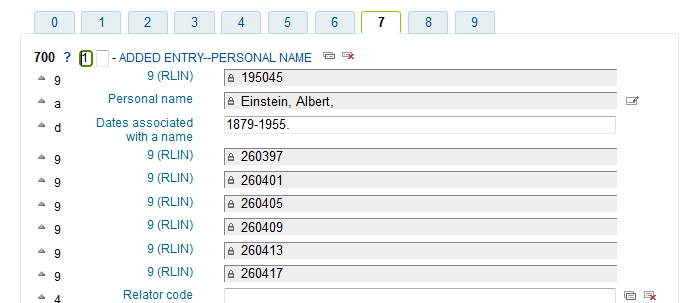 Created attachment 12510 [details] Screenshot of edit screen Following system preferences are set in Authorities tab: AutoCreateAuthorities --GENERATE BiblioAddsAuthorities --ALLOW dontmerge --DO UseAuthoritiesForTracings --DON'T Linker CatalogModuleRelink --DO LinkerKeepStale --DON'T LinkerModule --First Match LinkerOptions <blank> LinkerRelink --DO When editing a bibliographic record, (editing anything) Koha relinks the bib record to a machine generated auth record and retains the previous link. So, multiple $9 fields are created for every tag that links to an authority record. Part of MARCxml in biblioitems <datafield tag="100" ind1=" " ind2=" "> <subfield code="a">Einstein, Albert</subfield> <subfield code="d">1800-2010</subfield> <subfield code="9">260394</subfield> <subfield code="c">Numero Uno</subfield> <subfield code="9">260395</subfield> <subfield code="9">260399</subfield> <subfield code="9">260403</subfield> <subfield code="9">260407</subfield> <subfield code="9">260411</subfield> <subfield code="9">260415</subfield> </datafield> <datafield tag="650" ind1=" " ind2="0"> <subfield code="a">Relativity (Physics)</subfield> <subfield code="9">253848</subfield> <subfield code="9">260396</subfield> <subfield code="9">260400</subfield> <subfield code="9">260404</subfield> <subfield code="9">260408</subfield> <subfield code="9">260412</subfield> <subfield code="9">260416</subfield> </datafield> <datafield tag="700" ind1="1" ind2=" "> <subfield code="9">195045</subfield> <subfield code="a">Einstein, Albert,</subfield> <subfield code="d">1879-1955.</subfield> <subfield code="9">260397</subfield> <subfield code="9">260401</subfield> <subfield code="9">260405</subfield> <subfield code="9">260409</subfield> <subfield code="9">260413</subfield> <subfield code="9">260417</subfield> </datafield> <datafield tag="830" ind1=" " ind2="0"> <subfield code="a">Bonanza paperback.</subfield> <subfield code="9">253849</subfield> <subfield code="9">260398</subfield> <subfield code="9">260402</subfield> <subfield code="9">260406</subfield> <subfield code="9">260410</subfield> <subfield code="9">260414</subfield> <subfield code="9">260418</subfield>