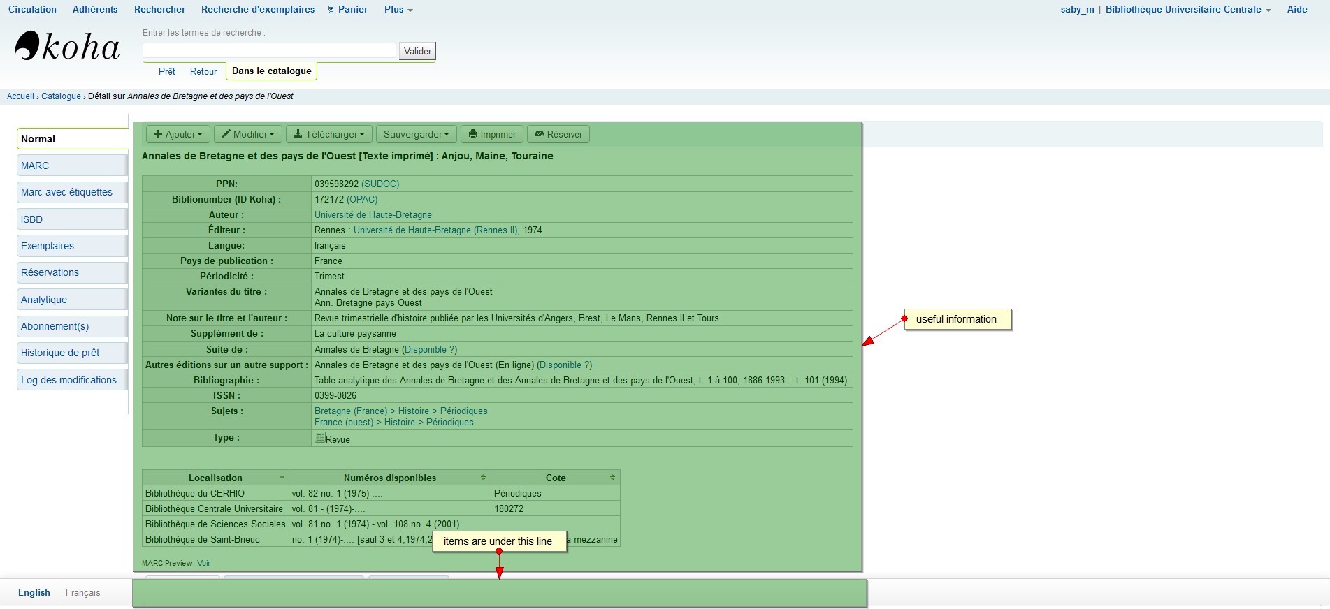 Hello Katrin Owen's argument is interesting, but it could be applied to all pages ;-) For example, even in Normal view, I need to scroll to see the items of some records (because I have some toolbars in my firefox, and a bottom Koha bar to change language...). The header takes a lot of space is taken on each page. Maybe a solution would be to reduce its height on all pages? Or maybe to make it "sticky", so that it would always be usable even if we scroll down the page? See capture1 : a serial record in Rennes 2 Koha ; you cannot see the items See capture2 : the items of this serial. Even without header, you cannot see all items (more than 100...). Regarding additem, displaying ALL the items linked to a record is sometimes not a good idea. Maybe we could display only x (10? or a value in a syspref?) items, and hide the other with CSS, with a button/link for showing more? I don't have a solution, but I am sure this page could be improved... Mathieu