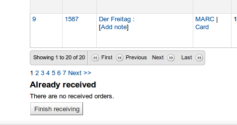 Created attachment 17414 [details] screenshot On the order receive page there are 2 different paginations - an old link based one and the new datatables paging. 1) Start receiving a new shipment for a vendor with lots of outstanding orders 2) Scroll to bottom of the page