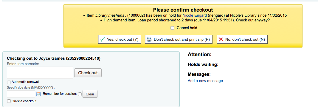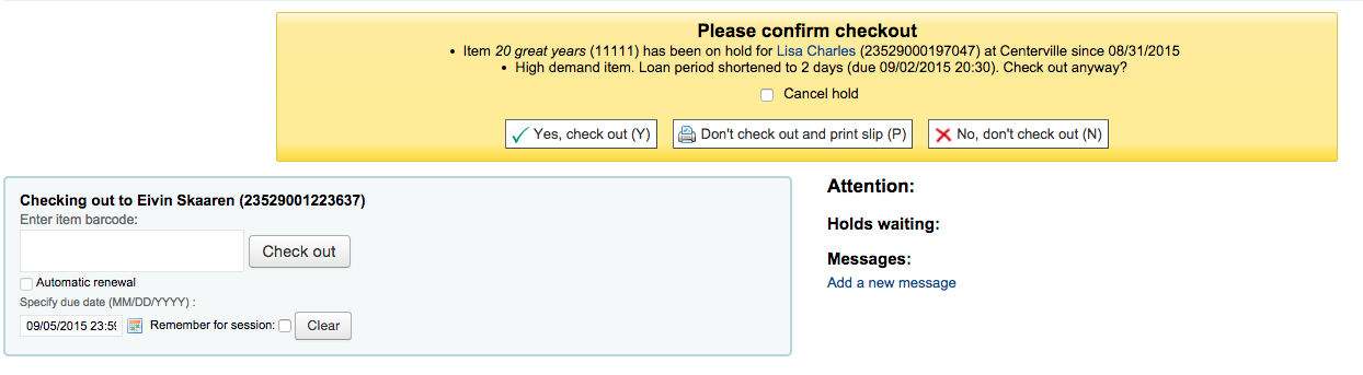 I've been giving this some thought and I don't mind the current workflow where you get a chance to tell a patron that the book will have a shorter loan period than usual. But the problem is that decreaseLoanHighHolds hooks into duedatespec and overwrites it. So even if you auto clear after using highholds you will lose any date you had entered manually. My two cents is that this could be solved with this workflow: 1) When highholds is active pick upp anything stored in "duedatespec" and stick it into the new parameter "specifiedDueDateToRestore" 2) Let highholds overwrite duedatespec as it currently do. 3) When circulation.pl finds a non empty specifiedDueDateToRestore parameter stick this back into duedatespec. This way the due date from highholds will be the one off value it's supposed to be and manually defined due dates will be restored. I've been looking at 10067 from a few different angles and this is what I can come up with that does'nt change peoples current workflow. I have yet to discover any fatal flaws with this approach althoguh there might be several for all I know.