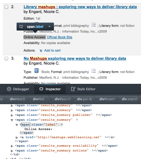 Created attachment 18119 [details] [review] Bug 10218 - In OPAC XSLT search results, add class to 'online access' In some cases in OPAC search results and the detail page there is a class specific to each line of data being output (publisher, date, subjects, etc). In other cases there is no additional class. This patch makes modifications to a few different OPAC files in an attempt to make them consistent with each other. To test, apply the patch and view: - an OPAC detail page with OPACXSLTDetailsDisplay off - the OPAC search results page with OPACXSLTDetailsDisplay off - the OPAC search results page with OPACXSLTDetailsDisplay on Labels should have classes relevant to their data. To test the specific case requested by this bug, view details/results for a record which includes online resources (856u in MARC21).