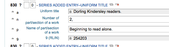 Some notes for reproducing this: - you need to make p and n visible in the MARC editor, to make it possible to catalog the attached example. - You also have to make sure you have a matching 490 field with the first indicator = 1, else the information is pulled from the 490 field.