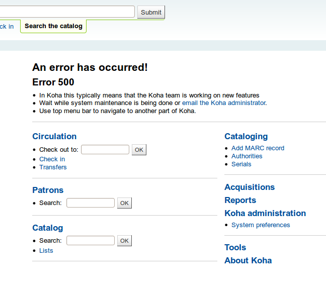 Created attachment 38110 [details] [review] [PASSED QA] Bug 10285: Remove links from the error pages The error page (400, 401, 402, 403, 404, 405 and 500) displays parts the old staff client main page. The user can easily browses using navigation links. Test plan: Go on the 400.pl, 401.pl, 402.pl, 403.pl, 404.pl, 405.pl and 500.pl pages, and confirm all is fine and you don't get the old style blocks. Signed-off-by: Nick Clemens <nick@quecheelibrary.org> Signed-off-by: Katrin Fischer <katrin.fischer.83@web.de> http://bugs.koha-community.org/show_bug.cgi?id=10258