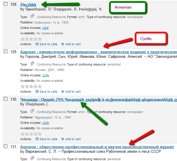 Created attachment 19297 [details] After activating the option 'Relevance'->'Title A-Z' Armenian and Cyrillic records are mixed.