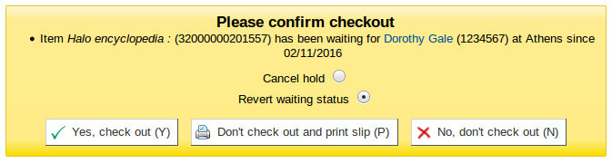 Maybe 3 buttons - no radio buttons. So : Revert waiting status & Check out Cancel hold & Check out No, don't check out