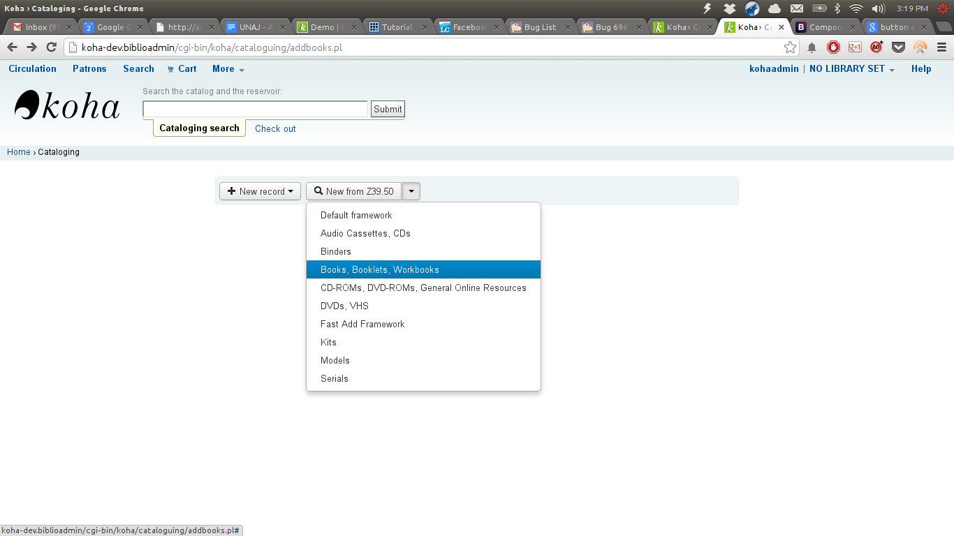 Everything looks good and works well with one exception: If I click the button without choosing one of the menu choices the framworkcode is passed as "undefined" instead of being empty. With "undefined" the default framework isn't loaded and I get an MARC edit screen with no fields.