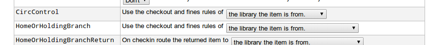 For the most part the system goes like this for selecting circulation rules: If CircControl is set to "the library you are logged in at" circ rules will be selected based on the logged in branchcode If CircControl is set to "the library the patron is from" circ rules will be selected based on the patron's branchcode If CircControl is set to "the library the item is from" circ rules will be selected based on the items branchcode where HomeOrHoldingBranch chooses if items.homebranch is used or items.holdingbranch is used. Also, from my reading of master, it appears that the system preference in question is HomeOrHoldingBranch, not CircControl. That is, if IndependentBranches is enabled, and the item's branchcode does not match the logged in library branchcode ( the choosing of which is via HomeOrHoldingBranch ), the item cannot be issued ( unless you are a super-librarian ). Really, what we should do is remove the "the library the item is from" option from CircControl and add "the library that owns the item" and "the library that is holding the item" so we can remove HomeOrHoldingBranch from the circulation rules logic altogether. Then, we can identify what HomeOrHoldingBranch still does, and rename it to something more descriptive and accurate.
