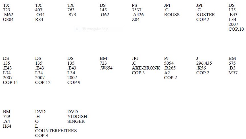 (In reply to Chris Nighswonger from comment #11) > Nicole, > > Will you please post an example call number from this system? And is it LLC? > It's LCC. Samples: SpColl PS 3505 .U334 A17 1959 SpColl PS 1322 .S45 1962 BF 173 .L14213 1977 Watts PS 3535 .E75 T4 1969