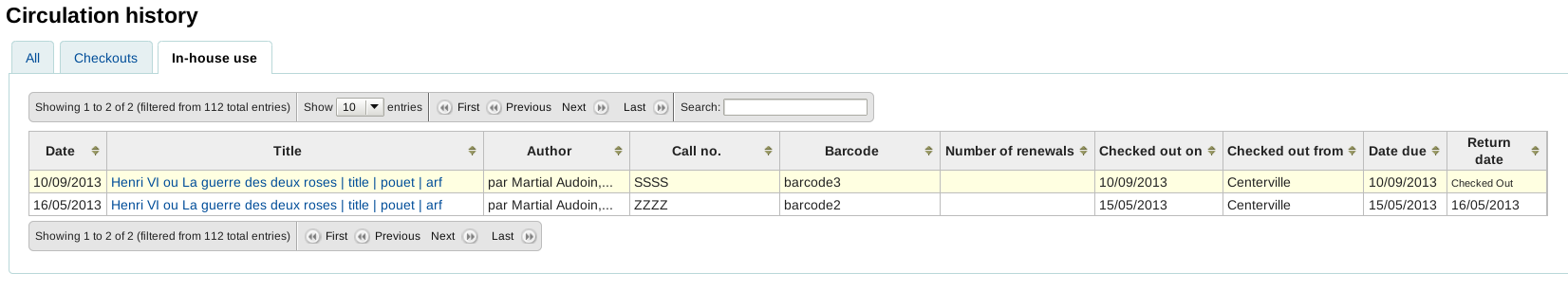 Created attachment 26114 [details] [review] Bug 10860: In-House Use This patch implements the In-House Use feature for Koha. It adds: - 2 new sysprefs: 'In-House Use' to enable/disable this feature 'In-House Use Forced' to enable/disable the feature for *all* users. - 2 new columns issues.inhouse_use and old_issues.inhouse_use - 1 new script misc/cronjobs/bulk_transfers.pl - Datatable on the circulation history pages (readingrec) at the OPAC and the intranet. A new checkbox in the Circulation tab. If checked, the issue become a in-house use (in the statistics and issues tables). When you check it, the due date changes to the today date. The syspref "In-House Use Force" allows to force the in-house use to permit the checkout even if the borrower is debarred or others problems. In the issue table, a new string (in red) marks the issue as "in-house use". The circulation history contains 3 tabs : "all", "checkout" and "in-house use" (OPAC and intranet). The cronjob script: If AutomaticItemReturn if off, a library would like not to do a transit operation manually. This script (to launch each night) do returns for a specific branches. Test plan: 1/ Execute the updatedatabase entry 2/ Enable the 'In-House Use' pref. 3/ Checkout a biblio for a patron and check the 'in-house use' checkbox. 4/ Check that the due date is the today date (with 23:59) and is not modifiable. 5/ Click on the check out button and check that the new check out appears in the table bellow with the "(In-house use)" string. 6/ Go on the circulation history pages (readingrec and opac-readingrec) and try the 3 tabs. In the last one, your last checkout should appear. 7/ Check in. 8/ Check readingrec pages. 9/ Choose a debarred patron and check that you cannot checkout a biblio for him. 10/ Switch on the 'In-House Use Forced' pref 11/ You are now allowed to checkout a biblio for the debarred patron.