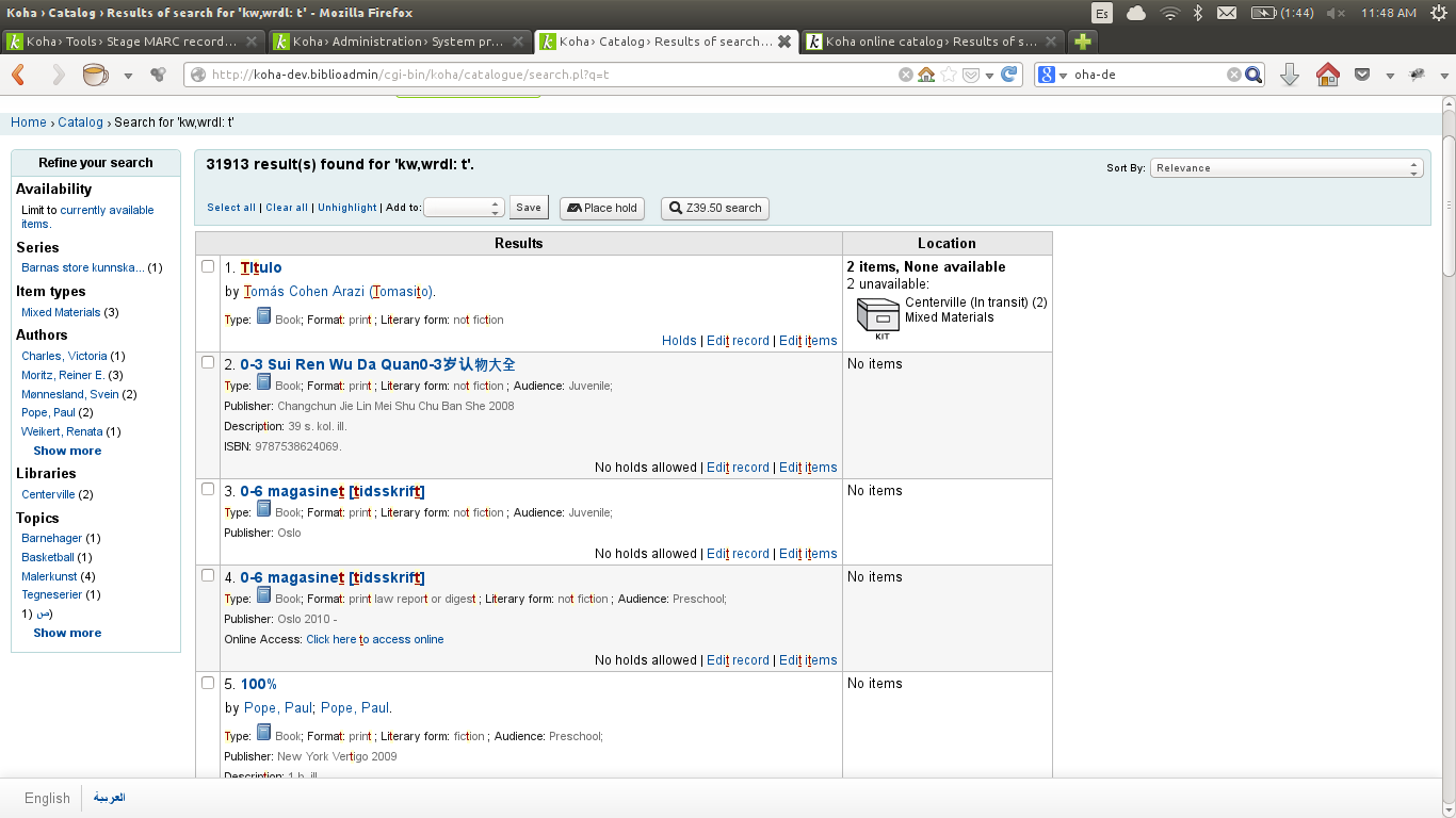 Created attachment 27553 [details] [review] [SIGNED-OFF] Bug 11117: Fix text mixed in facets where RTL text + facet count showed This patch adds classes for both the facet label and count, and adds 'inline-block' to the 'facet-count' class so text shows proplerly. To reproduce: - Have facets to show some right to left text (example on the bug report) in english language templates. - Enable the displayFacetCount. - Check it displays like the attached snapshot. To test: - Apply the patch - Do a search that previously reproduced the problem on the staff interface => Shows correctly - Repeat for OPAC (the three themes) => Shows correctly - Sign off :-D Regards To+ Sponsored-by: Universidad Nacional de Cordoba Signed-off-by: Bernardo Gonzalez Kriegel <bgkriegel@gmail.com> Work as described. Also checked with Arabic translation, OPAC bootstrap, prog and ccsr. Tested with arabic records. No koha-qa errors.