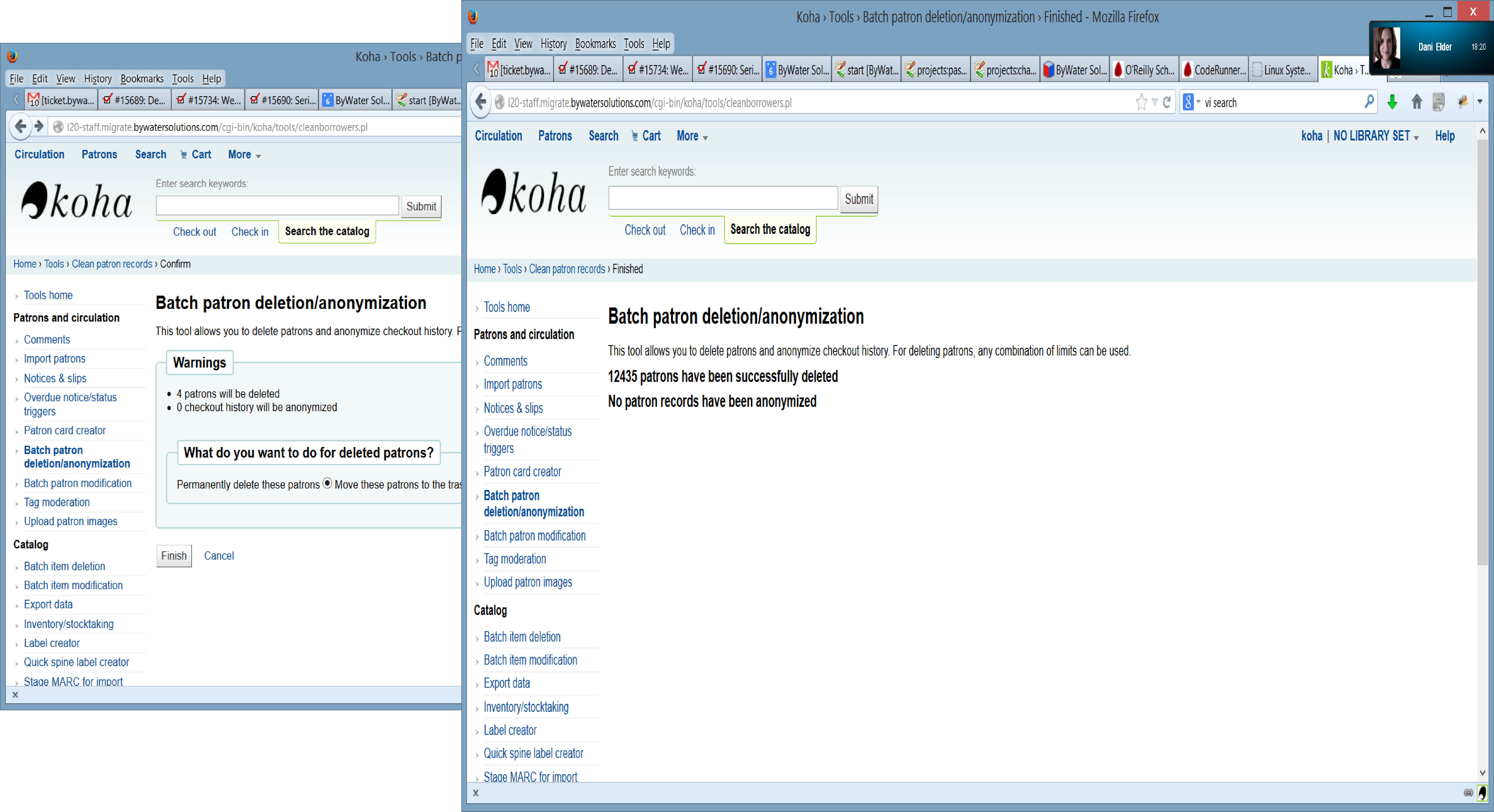 Created attachment 23346 [details] Warning 1 Tested in versions 3.12.6, 3.14 and 3.15 (Bywater demo) When deleting by dateexpiry in batch deletion tool. The warning states a low number, and then when it comes back with a total of deletion, it deletes thousands more than it give a warning for. For instance it warned it would delete 102, the deleted 3661 in one system. We can't get the accurate count it is deleting patron's on either way. When queried with the same parameters (dateexpiry) the number is different. To recreate. Go to Batch Patron/Anonymzation Tool Select a dateexpiry date Warning should come up with count to delete Select to Permanently delete (not put in trash) Count of deleted items will show differently than warning-by thousands.