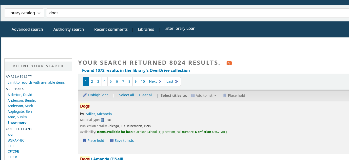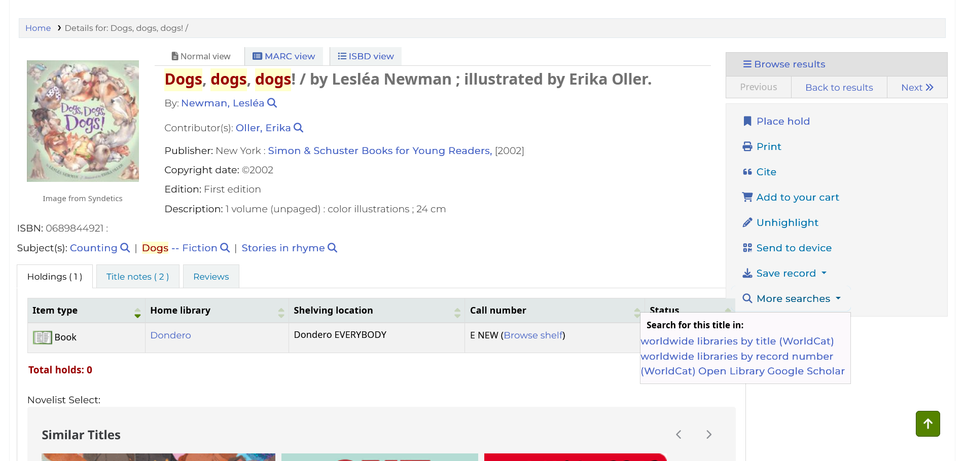 Sure, that's pretty close to what I'm thinking. We are in an area where libraries are independent of each other (enthusiastically so) but are geographically nearby and all use Koha. We have an existing state program for ILL handled through a different interface, but we may lose that due to funding cuts. Our libraries aren't interested in merging, and probably won't even be able to form a consortium or a true shared catalog. I hope this bug would make it possible for patrons to search a neighboring library's catalog without going to a special search screen. There are two ways I see this working: an additional entry in the "more searches" menu (to the right on opac-detail.pl, controlled by syspref OPACSearchForTitleIn) or something in that same right-hand column that says "look for this item nearby" and it searches for that ISBN in a set list of z39.50 targets. (See "details..." screenshot) The second way would be similar to the way that the Overdrive API works, where it takes the terms from a search and submits it to a set list of z39.50 targets. (see "results..." screenshot) If I remember correctly the ILL module can allow patrons to place a request that searches z39.50 targets, but I want patrons to just get the results before they place an ILL request. Let me know if that's not helpful!