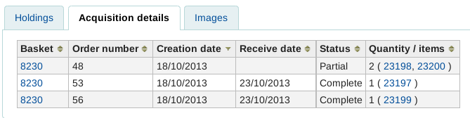 Created attachment 24550 [details] [review] [PASSED QA] Bug 11397: Remove the itemnumber list on the Acquisition detail tab Test plan: - verify this patch does not introduce regression on the enhancement introduced by bug 8230. - verify the itemnumber list does not appears anymore. Signed-off-by: Nicole C. Engard <nengard@bywatersolutions.com> The acquisitions details tab on the holdings table in the staff client no longer shows the links to the items. Tests pass. Signed-off-by: Katrin Fischer <Katrin.Fischer.83@web.de> Passes all tests and QA script. In my tests the itemnumbers didn't show up on the acquisition detail tab before the patch. So the patch visually only changed the column header for me. All other acquisition related information showed up ok.