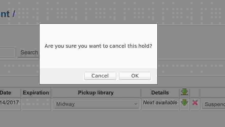 Would like to see a confirmation screen before deleting hold requests (request.pl). As it is now, if you purposely or accidently click on the delete button, the hold request is deleted instantly. Christopher