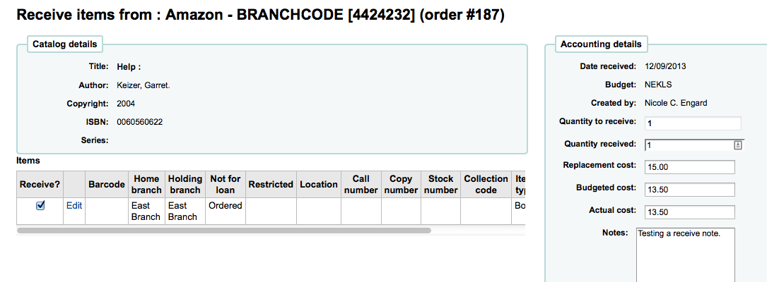Created attachment 26289 [details] [review] [PASSED QA] Bug 11699: Notes entered when receiving are not saved Revised test plan: 1/ Create an order with 2 items 2/ Receive 1 item and enter a note for the order 3/ Verify the note is not saved The note should be visible on the Mod Order Details screen, but it isn't there. 4/ Apply patch 5/ Receive the second item and enter a note for the order 6/ Verify the note is correctly saved The note is visible on the Mod Order Details screen. Signed-off-by: Mark Tompsett <mtompset@hotmail.com> Signed-off-by: Katrin Fischer <Katrin.Fischer.83@web.de> Passes all tests and QA script. Works as described. The note now saves correctly and also remains when you undo a receipt. Note: it would be nice to show the note on the receive page as well.