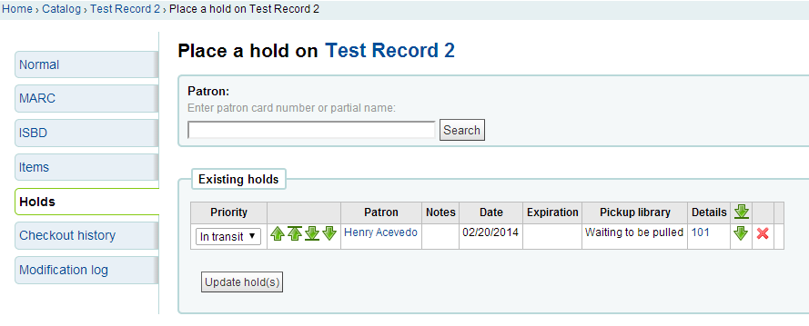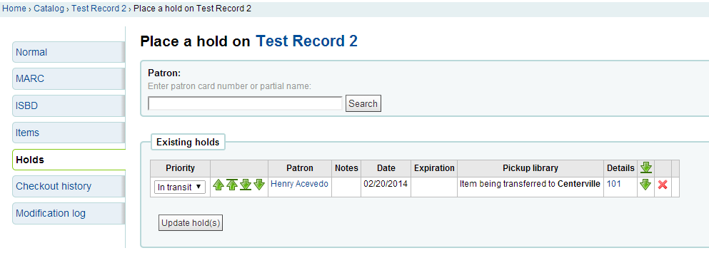 Created attachment 28670 [details] [review] [PASSED QA] Bug 11801: In transit hold items incorrectly labels as "Waiting to be pulled" on request.pl If an item needs to be transferred to fill a hold, the hold will be listed as 'Waiting to be pulled" while it is in transit. Test Plan: 1) Place a hold for pickup at another library 2) Check in the item, confirm the hold transfer 3) View the holds for that record ( request.pl ) 4) Note the priority is "In transit" and the status is 'Waiting to be pulled". 5) Apply this patch 6) Reload the holds page 7) Note the status is now "Item being transferred to $branch" Signed-off-by: Kyle M Hall <kyle@bywatersolutions.com> Signed-off-by: Martin Renvoize <martin.renvoize@ptfs-europe.com>