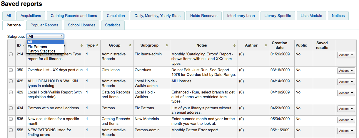 Created attachment 26161 [details] [review] [PASSED QA] Bug 11833 - Filtering on saved report subgroup doesn't work Filtering the list of saved reports by subgroup doesn't work because the filtering JavaScript was not updated when the table columns changed with Bug 3134. This patch corrects the target column for filtering. To test you must have multiple saved reports within one group, and at least one of those in a subgroup. - Apply the patch and go to Reports -> Use saved. - Click the tab for the group which contains your reports. - Choose the subgroup you want to filter on from the subgroup dropdown. The list of reports should be correctly filtered by your subgroup. NOTE: It seems weird to have the number of columns displayed change when filtered, but this patch does correct the filtering. Signed-off-by: Mark Tompsett <mtompset@hotmail.com> Signed-off-by: Katrin Fischer <Katrin.Fischer.83@web.de> Works as described, passes all tests and QA script.